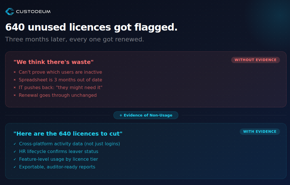 That’s what Custodeum gives you: the evidence to stop paying for licenses nobody uses.