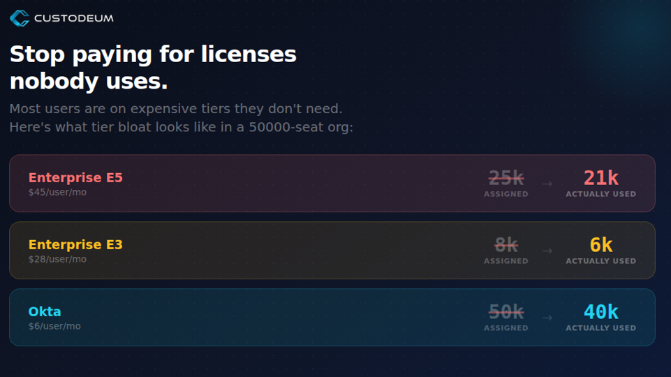 Somewhere inside that renewal is money you don’t need to spend ,ghost users still eating licenses months after they left, people sitting on Enterprise E5 tiers who’ve never touched a feature beyond email, and duplicate assignments nobody noticed because the data lives in three different consoles. In a 50,000-seat organization, these inefficiencies can quietly burn through hundreds of thousands of dollars a year.