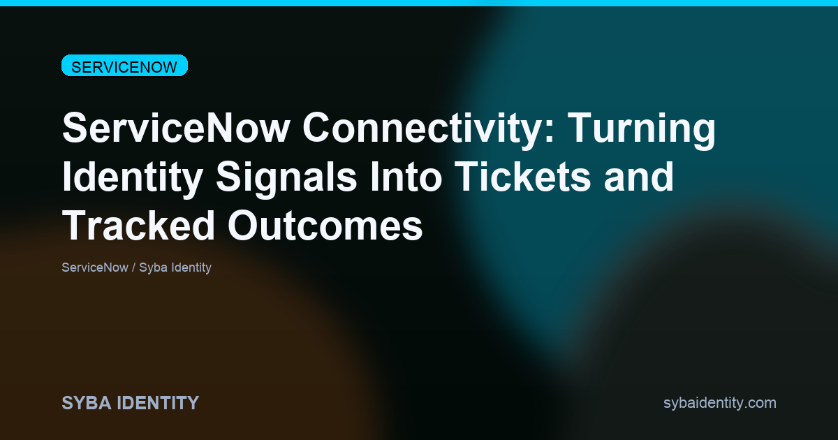 Syba’s ServiceNow connectivity helps teams connect identity signals to the system of record for operational work, improving speed, consistency, and audit readiness across the organization (Syba Identity).